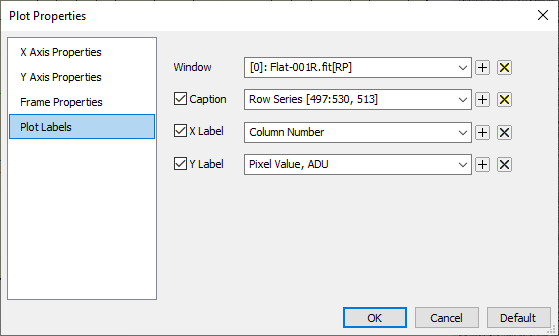 The Axis Labels and Titles page allows you to alter the text of the labels used in a Plot Window. Use this page to change the x and y axis labels, the caption, and the Plot Window caption. Mira saves recently used labels in the Profile controls for each property. This makes it easy to work with labels used in previous plots.