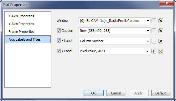 The Axis Labels and Titles page allows you to alter the text of the labels used in a Plot Window. Use this page to change the x and y axis labels, the caption, and the Plot Window caption. Mira saves recently used labels in the Profile controls for each property. This makes it easy to work with labels used in previous plots.