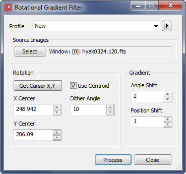 Next, use the Process > Filters > Rotational Gradient command to open the Rotational Gradient Filter dialog and set the properties as shown below. The Image Cursor was moved to near the comet's head and then the [Get Cursor X,Y] button was used to load its precise centroid coordinates into the dialog. :