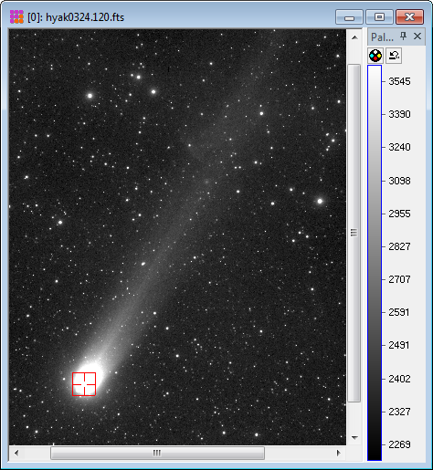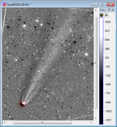 After clicking [Process], the following image appeared. The palette contrast was stretching somewhat to emphasize the bright-dark transitions which indicate intensity "edges" in the tail of the comet. Also notice how details are enhanced deep into the bright head of the comet.. To change the palette contrast and brightness, mouse-down on the palette color bar and move the mouse with the left button pressed.