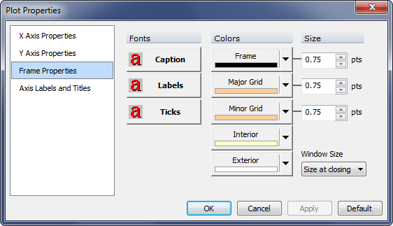 The Frame Properties page allows you to configure the frame of the plot, including the fonts, color, and grids.